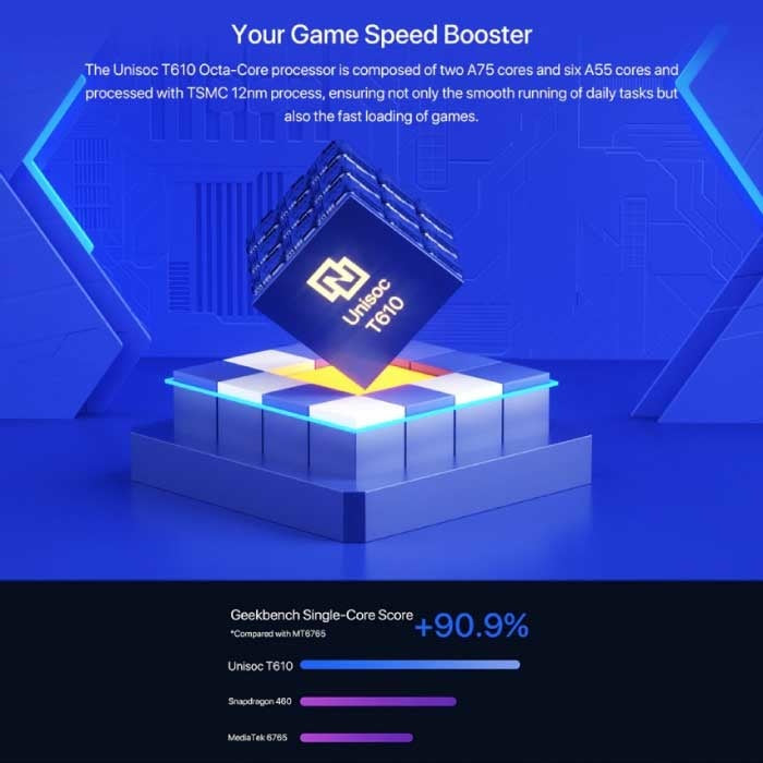Unisoc T610، ثماني النواة، 2xCortex-A75 & 6xCortex-A55، 1.8 جيجاهرتز |