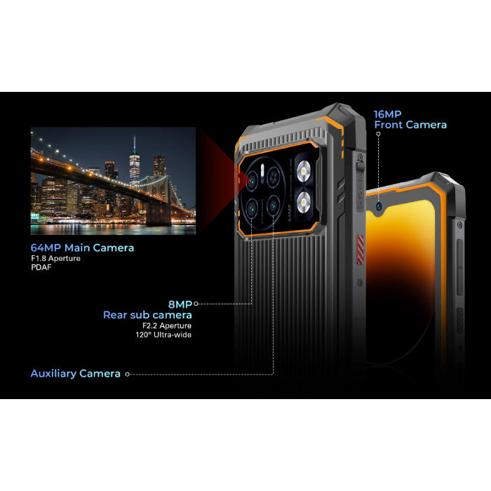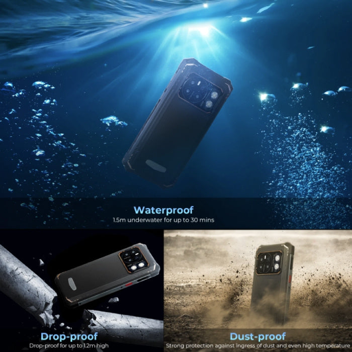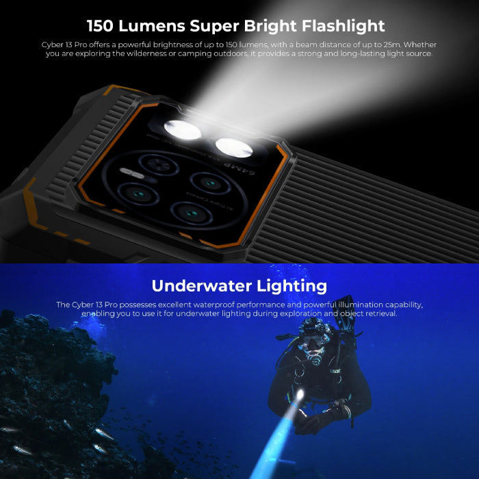 متين وقوي: بفضل تصميمه المقاوم للماء، يتحمل هاتف Hotwav Cyber 13 Pro الغمر حتى عمق 1.5 متر لمدة 30 دقيقة، مما يجعله الرفيق المثالي حتى في الظروف الصعبة. بالإضافة إلى ذلك، توفر المصباح اليدوي القوي بقوة 150 لومن ميزة إضافية تجعله مثالياً للمغامرين، حتى تحت الماء.