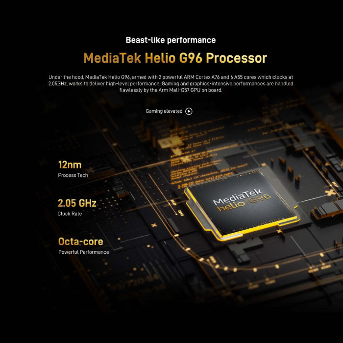 يصل الهاتف إلى سرعات عالية ولن يتوقف عن العمل بفضل معالج Helio G96 ثماني النواة وذاكرة الوصول العشوائي ثنائية القناة بسعة 8 جيجابايت. مثالي للألعاب المكثفة!