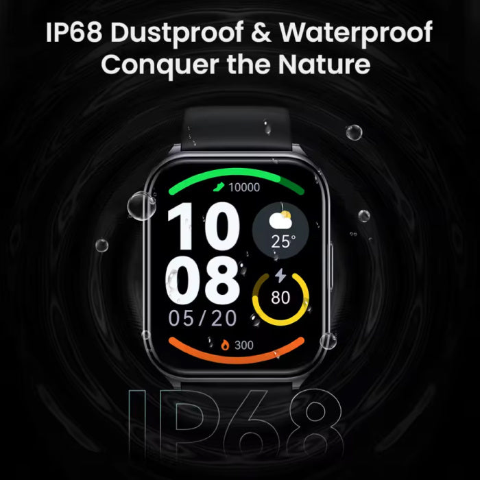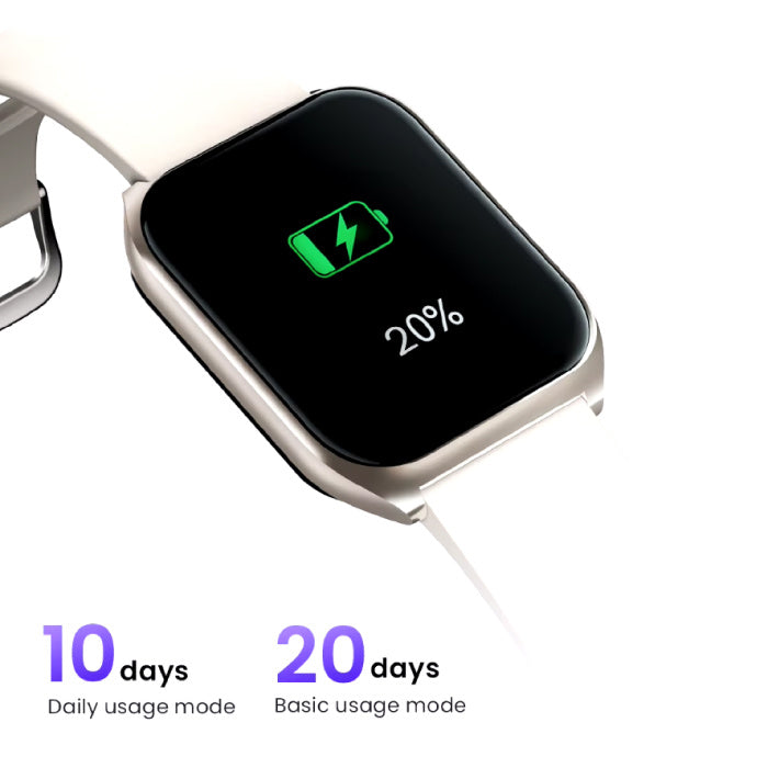 بفضل مقاومة الماء والغبار بمعيار IP68، يمكنك ارتداء هذه الساعة الذكية بدون قلق أثناء التمارين الشاقة أو الأيام الممطرة. مع عمر بطارية يصل إلى 10 أيام، لن تقلق بشأن الشحن أثناء الرحلات القصيرة.