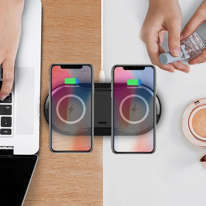 Hate charging cables that get lost or tangled? That is no longer necessary! With the 2 in 1 wireless charging station you can charge two devices wirelessly at the same time!