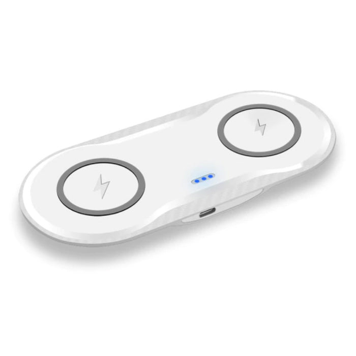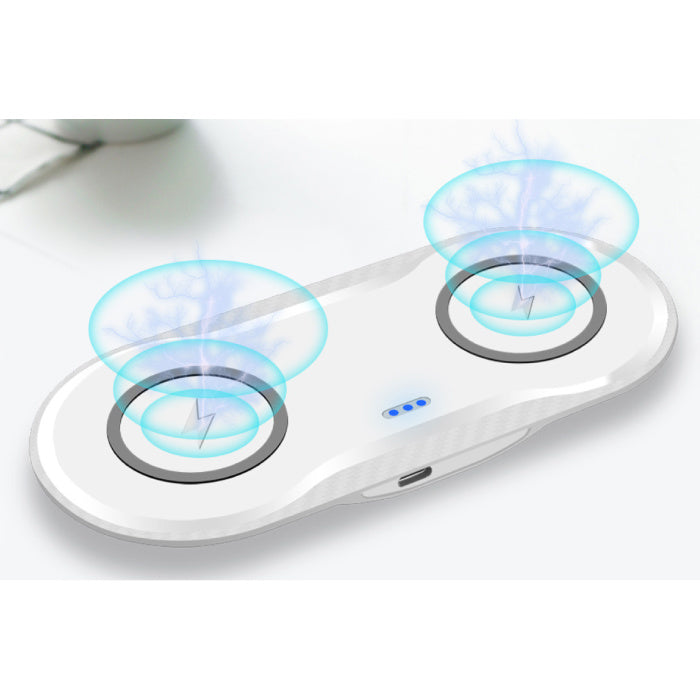 Hate charging cables that get lost or tangled? That is no longer necessary! With the 2 in 1 wireless charging station you can charge two devices wirelessly at the same time!