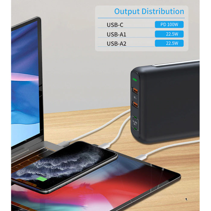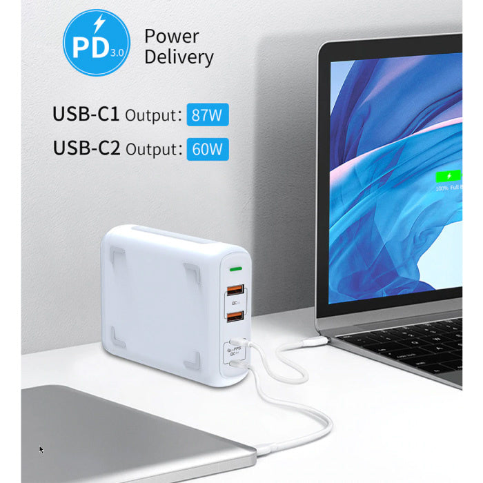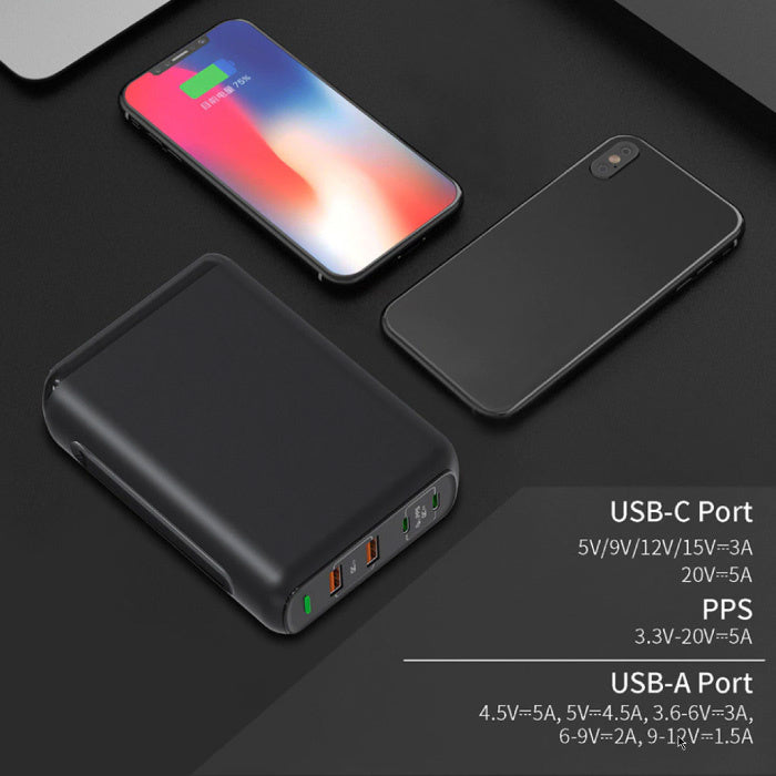 The charger has two USB-C ports with up to 150W PPS (Programmable Power Supply). The new PPS charger is the emerging standard for charging devices with even higher charging speeds then QC3.0 and battery saving technologies.