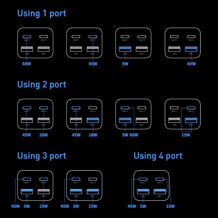 The charger has two lightning-fast 65W USB-C ports, a third fast 60W USB port en an extra 5W USB portWhen using multiple ports simultaneously, the wattage is distributed across all ports, with preference given to the USB-C ports.