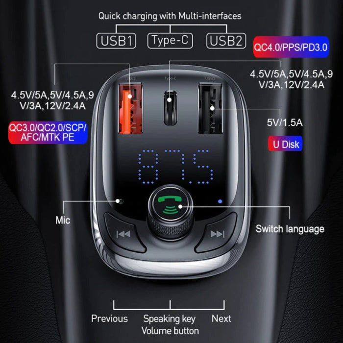 2x USB / USB-C Car Charger Bluetooth Transmitter Handsfree Charger FM Radio Kit Black
