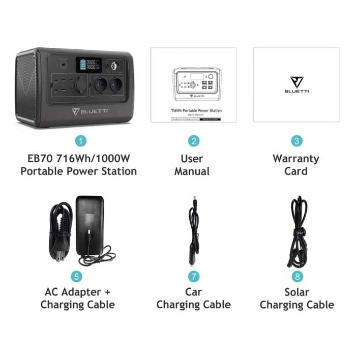 1x Bluetti EB70 Charging Station 716Wh 1x Manual |