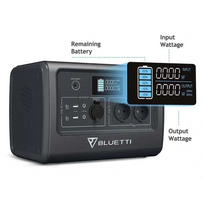 On the handy LCD screen you can see the current battery capacity and the wattage of the charging station's input/output. The charging station uses an improved Li-ion battery with LiFePO4 cells; this provides a longer cycle time, works against overheating and a higher discharge rate than other battery cores.