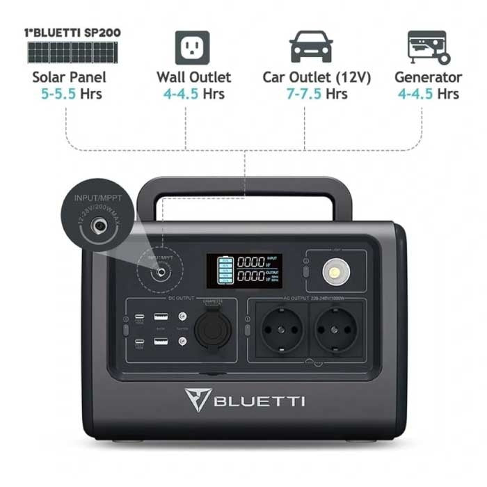 The charging station itself can be charged via a DC-in port. This allows you to connect it to solar panels, a generator, your car, or a simple wall socket. The station is easy to take with you thanks to the foldable handle at the top.