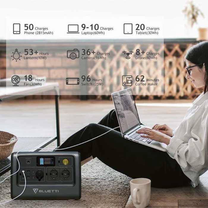 With the Bluetti EB70 charging station, traveling and camping is a pleasure! 716Wh capacity You can charge a typical smartphone for up to 50 times, but you can also power a mini fridge for more than 10 hours.