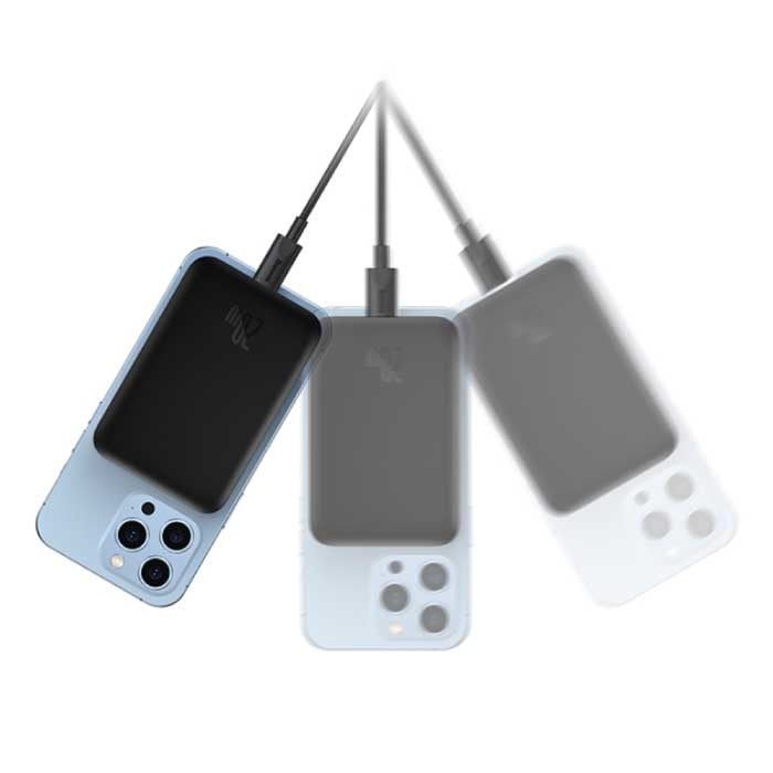 Con esta batería externa, ya no necesitas cables; se conecta directamente a tu teléfono gracias a su conexión magnética. La batería externa comienza a cargarse automáticamente de forma óptima. La velocidad de carga inalámbrica es rapidísima; ¡puedes cargar un iPhone 12 hasta el 50 % en solo 20 minutos!