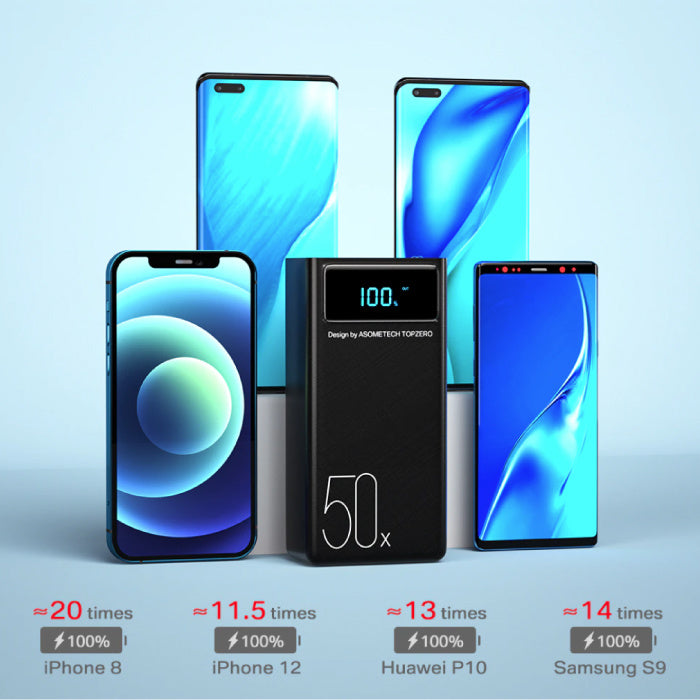 Gracias a su batería de 50 000 mAh, esta batería externa ofrece una duración increíble, permitiéndote recargar fácilmente tu iPhone o smartphone al menos diez veces. La pantalla LED muestra la carga actual de la batería, el voltaje y el amperaje.