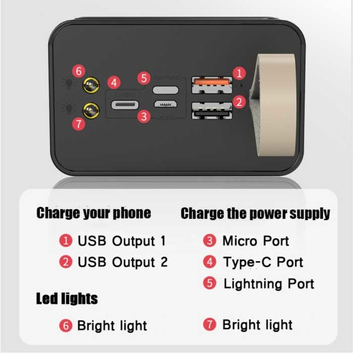 El banco de energía tiene una linterna incorporada, adecuada para iluminar mientras acampa o como iluminación de emergencia en caso de un corte de energía.