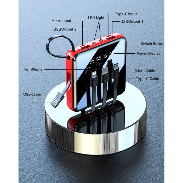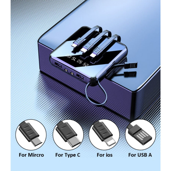 Mini banco de energía universal de 10,000mAh - 4 tipos de cable de carga - 2x USB LED Display Batería de emergencia Cargador de batería Cargador Negro