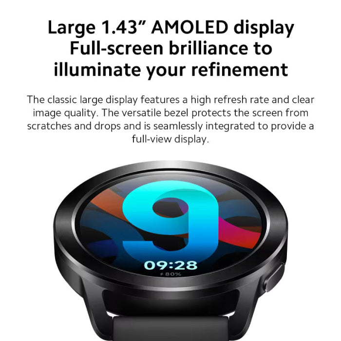 Disfruta de una pantalla AMOLED circular de 1,43 pulgadas con una impresionante resolución de 466 x 466 píxeles. Esta pantalla ofrece colores brillantes y vibrantes, para que siempre tengas una visión nítida, incluso con luz solar intensa.