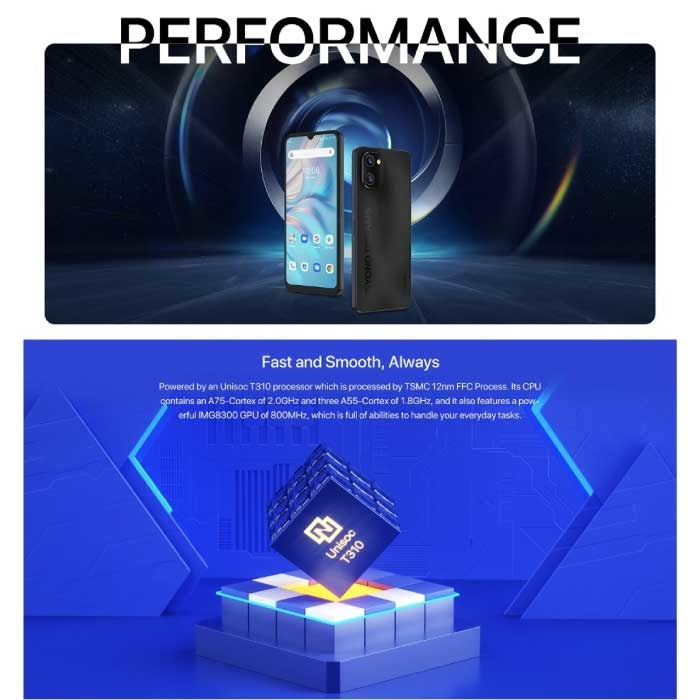 Unisoc T310, cuatro núcleos, 1x Cortex-A75 y 3x Cortex-A55, hasta 2,0 GHz |