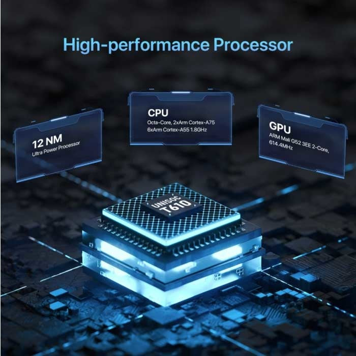 Unisoc T610, ocho núcleos, 6 procesadores ARM Cortex-A55 y 2 procesadores ARM Cortex-A75 a 1,8 GHz |