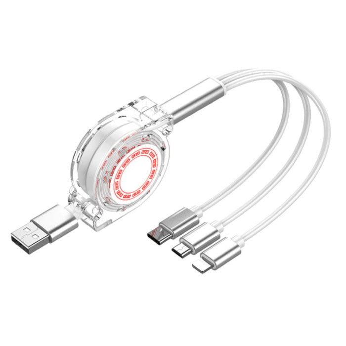 Câble de charge rétractable 3 en 1 - iPhone Lightning / USB-C / Micro-USB - Câble de données en spirale pour chargeur de 1,2 mètre Blanc-Transparent