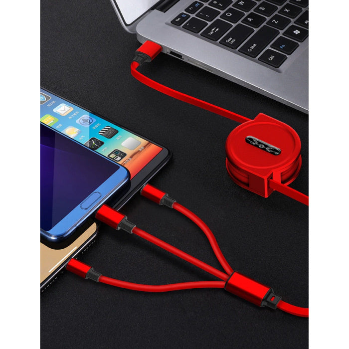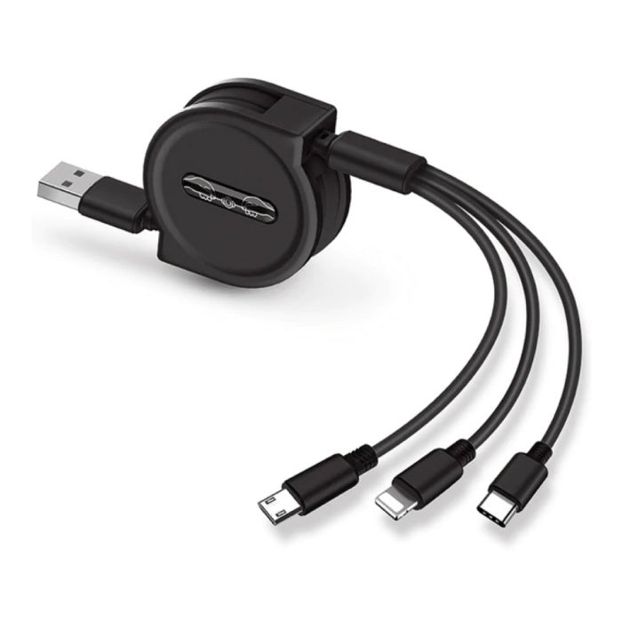 Câble de charge rétractable 3 en 1 - iPhone Lightning / USB-C / Micro-USB - Câble de données en spirale pour chargeur de 1,2 mètre Noir