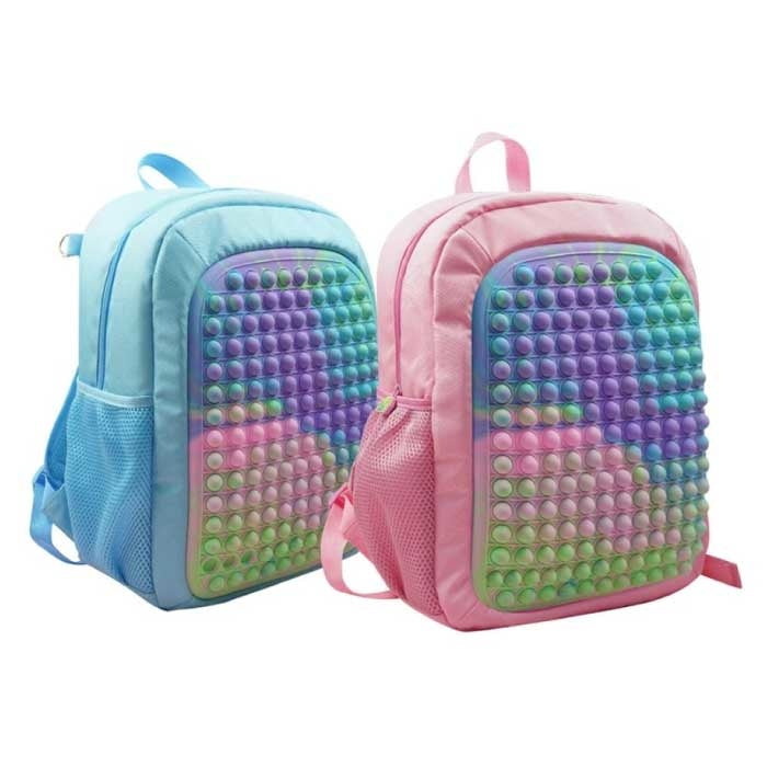 Ten mały plecak jest w całości wykonany z nylonu i silikonu. Cały tył plecaka to jedna duża powierzchnia do zabawy Pop-It, bardzo popularna wśród dzieci!