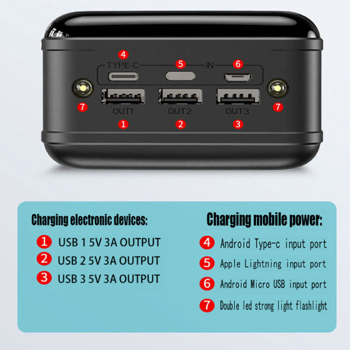 Diverse Invoermogelijkheden: Deze geavanceerde powerbank is ontworpen met gebruiksgemak in gedachten. Met drie verschillende input poorten - USB-C, micro-USB en Apple Lightning - kun je de powerbank op verschillende manieren opladen, afhankelijk van je beschikbare kabels en apparaten.