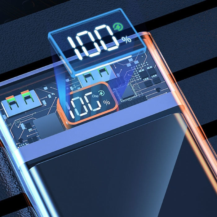 De powerbank beschikt ook over twee USB-oplaadpoorten, waarmee u twee apparaten tegelijk kunt opladen, zodat u niet hoeft te wachten tot het ene apparaat is opgeladen voordat u het andere oplaadt. Om u op de hoogte te houden van de status van de powerbank, is deze uitgerust met een LED-scherm dat in real-time de resterende energie weergeeft. Het LED-scherm laat ook de status van het oplaadproces zien in drie verschillende kleuren, die aangeven of uw apparaat aan het opladen is, volledig is opgeladen of in stand-by modus staat.