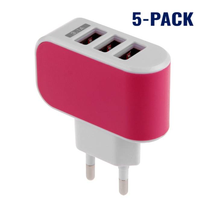 5-Pack Triple (3x) USB Port iPhone/Android Muur Oplader Wallcharger AC Thuis Roze