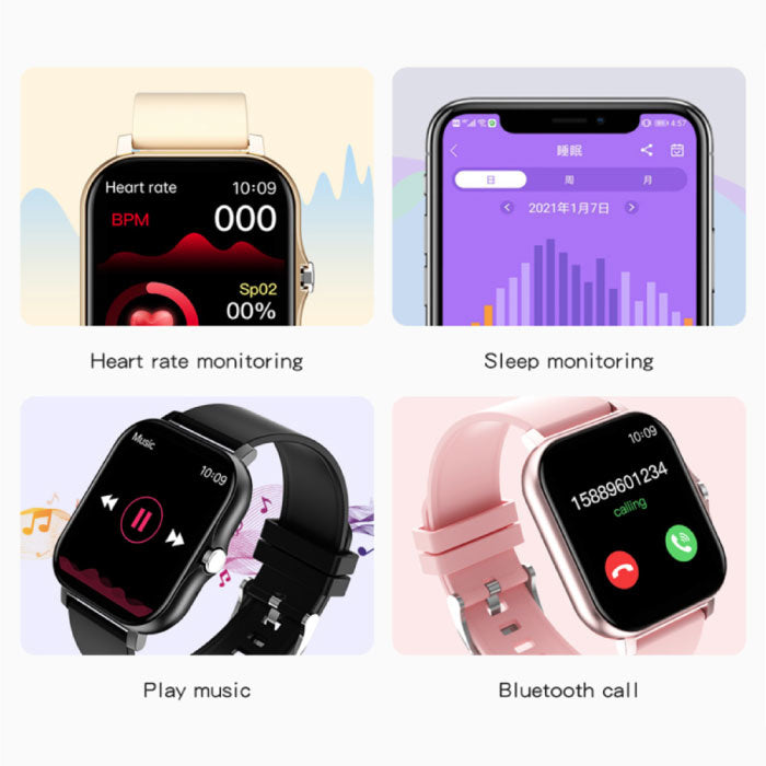 Hartslagmeter Bloed zuurstofmeter Calorieëenteller Alarm/Reminder Mediabediening Meldingen ontvangen Gesprek afleggen Alarm Weersvoorspelling Stappen/trappen teller Slaap monitoring Stopwatch Veel beschikbare thema's |