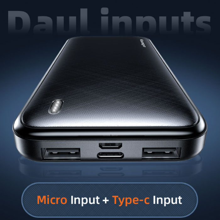 Het is mogelijk om twee apparaten tegelijk op te laden dankzij de 2 USB uitgangspoorten. De powerbank zelf kan worden opgeladen de USB-C of Micro-USB poort.