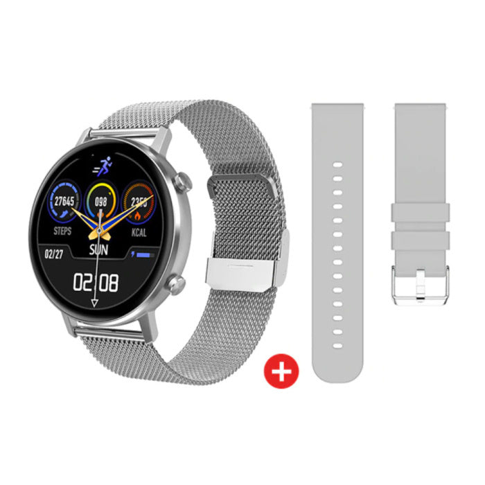 Deze smartwatch heeft standaard een roestvrij stalen mesh bandje en wordt geleverd samen met een siliconen bandje. Zo kan je deze uitwisselen wanneer je stijlvol of sportief wil overkomen.