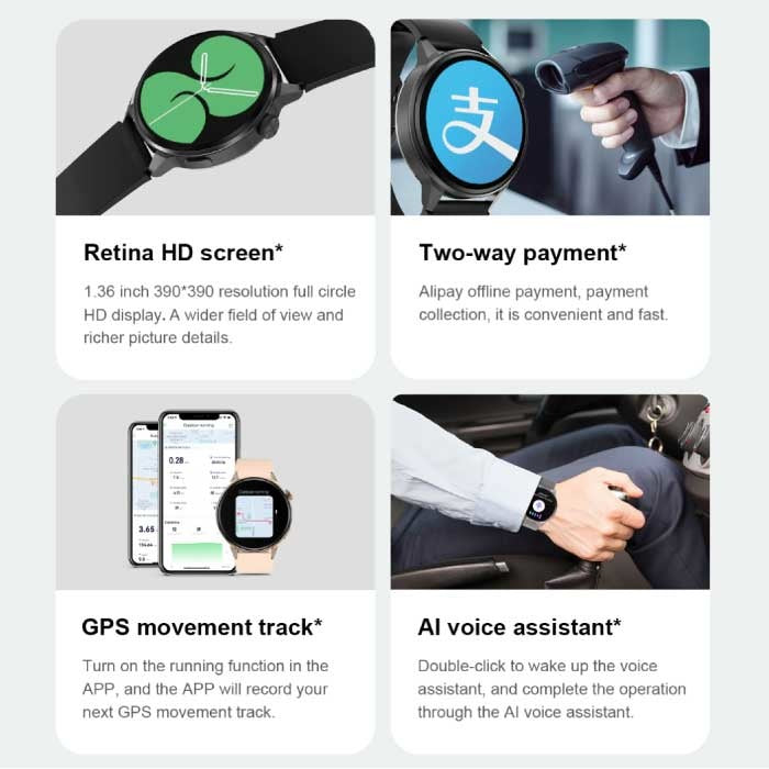 O smartwatch possui ainda um prático Função NFCAssim, pode ligar e controlar todos os seus dispositivos NFC a partir do seu smartwatch. Beneficia também dos recursos integrados de... GPS para rastrear a sua posição e assistente de voz de IA que pode aceder diretamente pelo relógio.