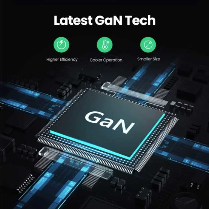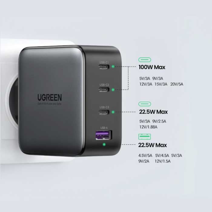 UGREEN 4-Port Charger är en premium snabbladdare som använder den senaste GaN-tekniken, vilket gör att du kan kan ladda fyra enheter samtidigt Laddning med ultrahöga hastigheter. GaN står för galliumnitrid, ett kristallint material som kan hantera mycket högre spänningar än vad som tidigare varit möjligt med laddare.