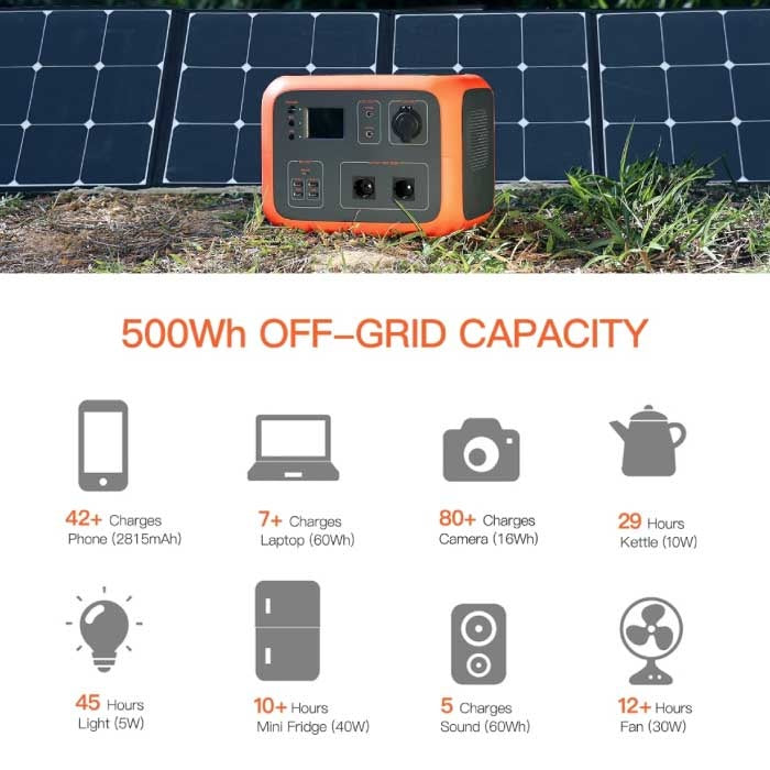 Med laddningsstationen Bluetti AC50S blir det ett nöje att resa och campa! 500 Wh kapacitet Du kan ladda en vanlig smartphone upp till 42 gånger, men du kan också driva ett minikylskåp i mer än 10 timmar.