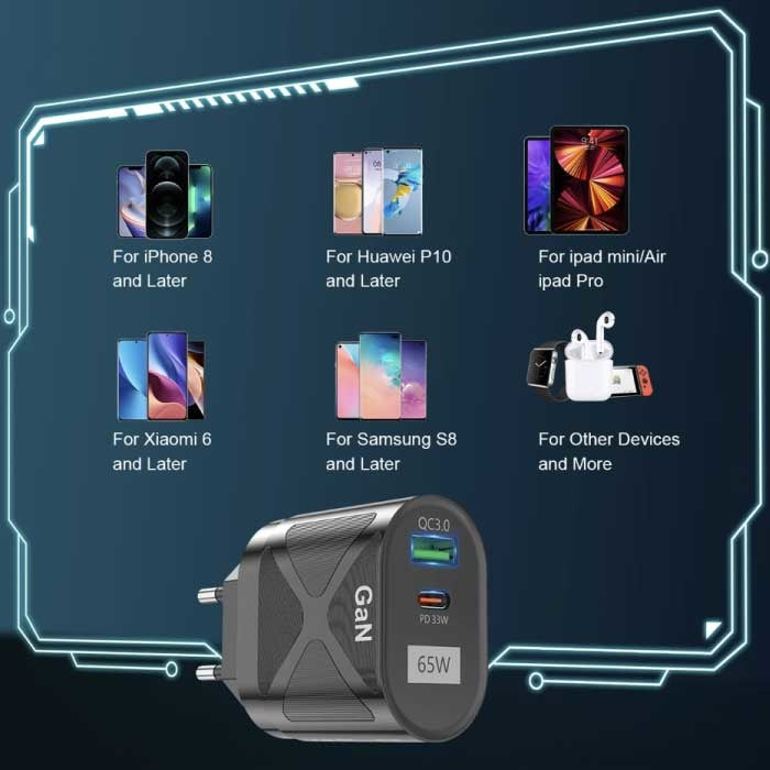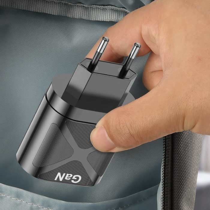 Dessutom har plug-in-laddaren en Quick Charge 3.0 USB-port För en andra, ultrasnabb laddningsport. På så sätt kan du ladda alla dina enheter samtidigt med höga hastigheter. När du laddar två enheter samtidigt delas 65W-effekten mellan båda portarna.