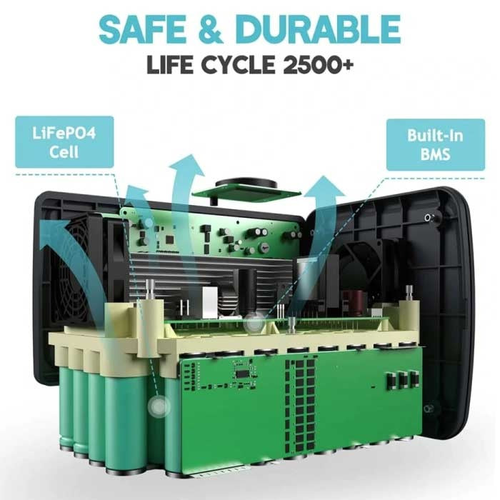 På den praktiska LCD-skärm du kan se den aktuella batterikapaciteten och effekten på laddstationens ingång/utgång. Laddstationen använder en förbättrad Li-jonbatteri med LiFePO4-cellerDetta ger en längre cykeltid, motverkar överhettning och en högre urladdningshastighet än andra batterikärnor.